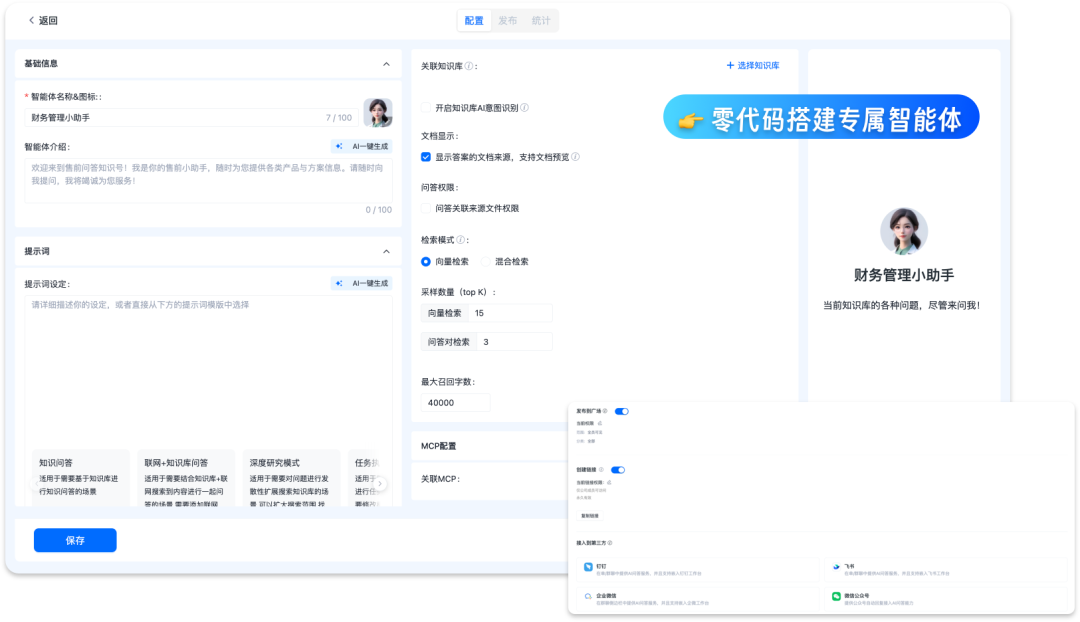 零代码搭建专属智能体:企业可基于部门、业务线或项目颗粒度,在平台上即时生成具备独立技能、知识库与权限范围的专业智能体,并一键调用 MCP 工具及插件生态,确保输出与业务场景精准匹配。同时360AI企业知识库可以通过标准 API 或 MCP 协议无缝对接 OA、CRM、ERP等业务系统,实现智能体深度融合现有企业工作流中。
