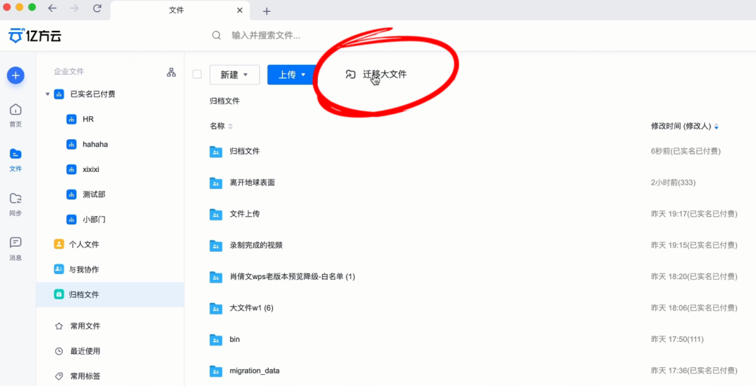 (3)如果需要归档的文件特别多,需要批量、快速归档,那么统一将文件放到文件夹中,点击【迁移大文件】即可。
