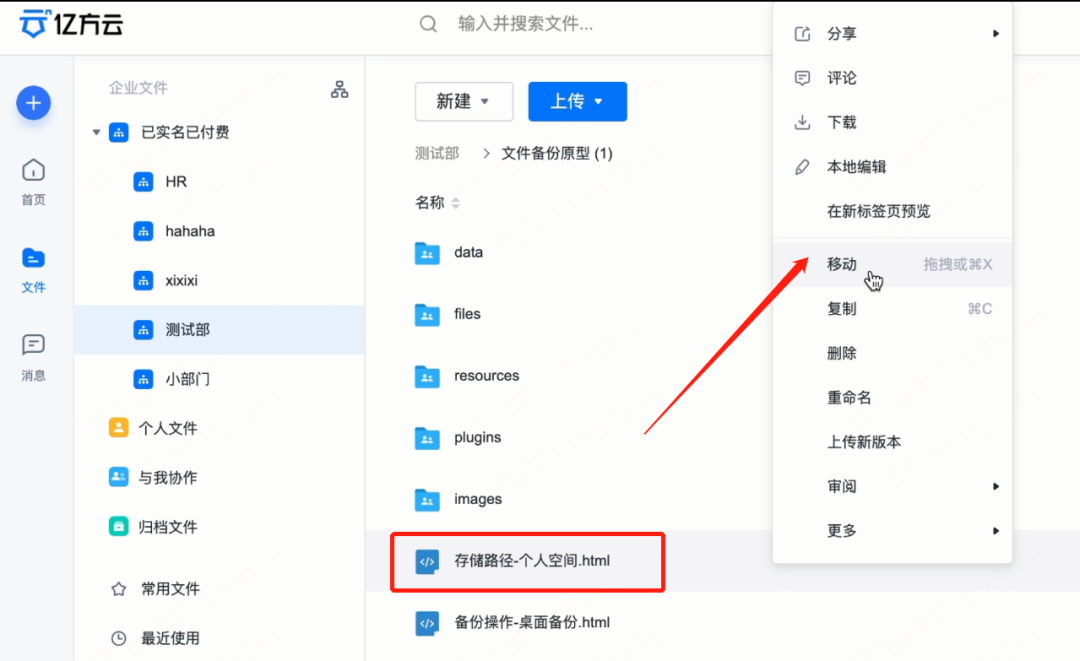 (1)如果想把云盘中已有的文件转移到“归档大空间”,选择文件,点击【移动】,并选择目标文件夹为【归档文件】即可;