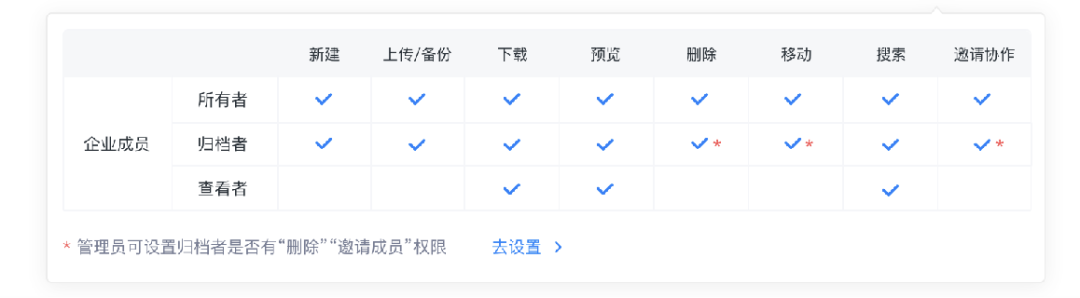 所有者可以决定是否给予归档者【邀请成员加入协作】【移动文件】【删除文件】的权利。